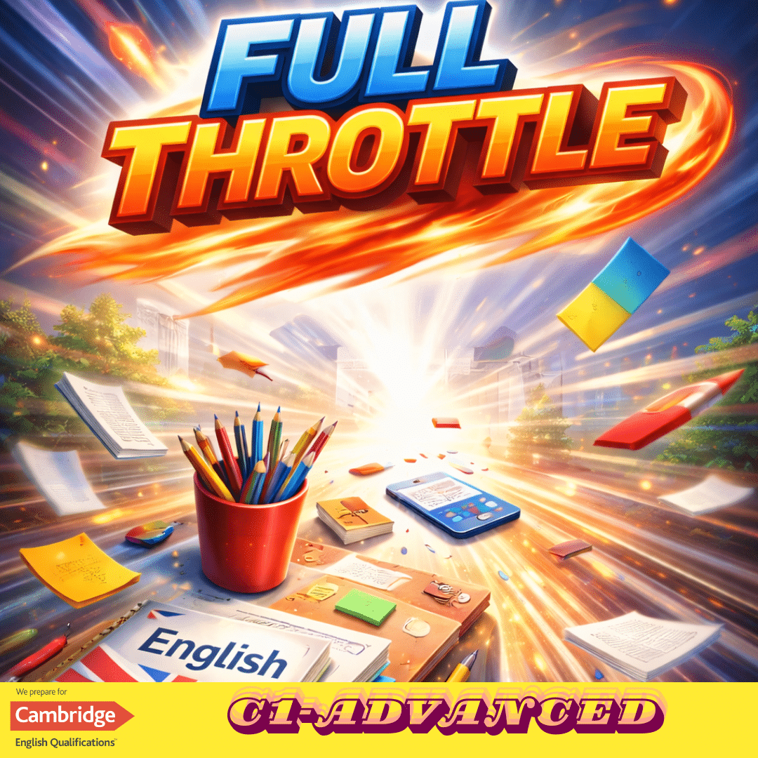 L’expressió “Full Throttle” s’utilitza en anglès per referir-se a anar a màxima velocitat, amb tota l’energia i el compromís. És un curs intensiu dissenyat per avançar ràpid, consolidar coneixements i assolir el nivell C1 en poc temps, amb un enfocament clar en la preparació i superació de l’examen C1 Advanced.